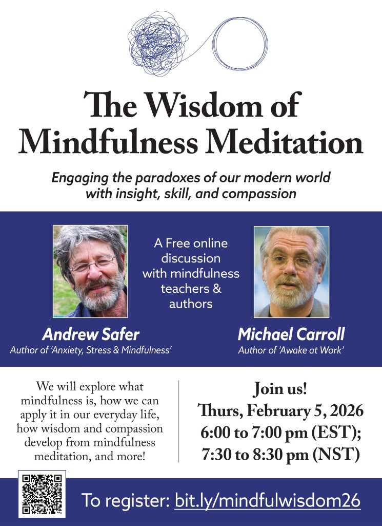 October 16–Gerri Lynn Mackey of VOCM interviewed Andrew Safer about the outcomes reported on the recent “Suicide Prevention Through Mindfulness Training” program. Listen to the 5-minute interview! FOR IMMEDIATE RELEASE Contact: Andrew Safer Phone: (709) 771-6908 Email: safermindfulness@gmail.com ST. JOHN’S, NEWFOUNDLAND AND LABRADOR, October 14th—A mindfulness training program aimed at reducing the power of suicidal thoughts (April-June) is showing some promising results. When asked to rate the statement “I have thoughts about suicide often”, disagreement increased by 48% for 10 adults between the beginning and end of the 8-week program. According to self-reports, there was a 53% reduction in the intensity of suicidal thoughts for eight participants who responded to both pre- and post-evaluations. They rated intensity on a scale of one to ten, with ten being the most severe. The totals they reported dropped to 24 at the end of the program from 51 at the beginning. “They excelled in a wide range of competencies,” observes Mindfulness Instructor and Trainer Andrew Safer, “such as feeling they have control over thoughts, moods, and feelings (89% improvement). Mindfulness does not target specific objectives; its effects are deep and broad.” The program “Suicide Prevention Through Mindfulness Training” includes: sitting, walking, pausing, and loving-kindness practices, and presentations on topics such as Rumination and Disengaging from Thoughts, and A New Way to Relate to Feelings and Emotions. At the three-month follow-up in September, seven participants completed the evaluation, scoring 48% higher than the pre-evaluation, compared to 52% higher at the end of the program. Safer notes that when this program was developed and piloted in 2021 in partnership with Canadian Mental Health Association-Newfoundland and Labrador, there was a 41.7% reduction in the intensity of suicidal thoughts. Even so, he cautions that due to the small sample sizes, further implementations are needed. The Outcomes Summary is available here: https://bit.ly/SPOutcomesSummaryOctober2025 This project was sponsored by Khyentse Foundation, a United States non-profit organization. Safer Mindfulness (www.safermindfulness.com) of St. John’s develops and presents applied mindfulness training programs for mental health and addictions, and the workplace. ### From our two ADHD groups that met earlier this year (one 6-week group and one 9-week group), following are outcomes for 8 participants, for whom pre and post evaluations could be matched. The greatest improvement between beginning and end of program was in response to this statement: The next-greatest change was shown by the following statement: The third-highest change was in the statement: Participants were asked “How helpful has this workshop series been for you?” (on a scale of 1 to 10). Eleven people provided ratings, which averaged 8.8. The weekly program sessions are: Introduction: How Can Mindfulness Help? 1. Dealing with Distractions: Mindfulness of Breath 2. Focusing Attention: Being Present 3. From Restlessness to Resting the Mind 4. Finding the Inner Compass 5. Taking a Break from Reactivity 6. Listening Fully The weekly sessions include check-in, Mindfulness instruction / guidance / practice, debrief, presentation on the day’s topic, Q&A / discussion. Asked to comment on this workshop series, Barbara* wrote: “This program gave me simple, practical ways to bring mindfulness into my daily life with ADHD. Learning to pause before reacting and to stay present with one task at a time has been especially helpful. The weekly check-ins kept me accountable, and I’m starting to see how mindfulness could support my focus and emotional regulation.” *not her real name Register for either the free introductory session, or the full series: click here. Metro Suicide Prevention Program Uses Mindfulness to Empower Participants | VOCM Andrew Safer gave a talk on “Inner Conflict and Non-Duality” at the Hindu Temple’s Multifaith Symposium on Saturday, May 10th at the Temple’s Penny Lane location. Representing a Buddhist/Mindfulness perspective, he spoke about overcoming the dualistic framework of polarities: right/wrong, good/bad through non-duality and non-judgment. Safer quoted the Vietnamese meditation master Thich Nhat Hanh, and the Zen master Hakuin to illustrate this view. Other talks were presented from the Christian, Islamic, Jewish, Hindu, and Bahai traditions. Krissy Holmes’ interview on On the Go with Andrew Safer and Darren Fancey about “Suicide Prevention Through Mindfulness Training” on April 26th, is provided generously by CBC… Paddy Daly interviewed Andrew Safer on VOCM Open Line on Wednesday about the upcoming “Suicide Prevention Through Mindfulness Training” program starting Tuesday, April 29th. To listen, click: Open Line with Paddy Daly | VOCM Select Wednesday April 23, and go to 1 hr. 56 min. (1:56). “Mindfulness for Suicide Prevention: A Teacher’s Experience”: Mindful’s Interview with Andrew Safer, 2023. THE “SUICIDE PREVENTION THROUGH MINDFULNESS TRAINING” WORKSHOP SERIES IS FULL. “Improvement” shows the average percentage change from beginning to end of program (6 weeks later). I signed on for the course hoping to establish regular practice in my daily life. I saw this as a way to not only improve my well-being, but also to be better able to respond helpfully to others. The course provides plenty of tools to make progress on these things. The small group zoom sessions, Andrew’s leadership and decades of experience with practice and teaching, the wisdom and encouragement from all in the group, and of course the sitting practice throughout the year. Whether in future I teach the practice myself or just keep working on my original goals, I have learned so much and enthusiastically recommend this course and Andrew’s other programs to all. – Patricia Dold, PhD, Associate Professor, 